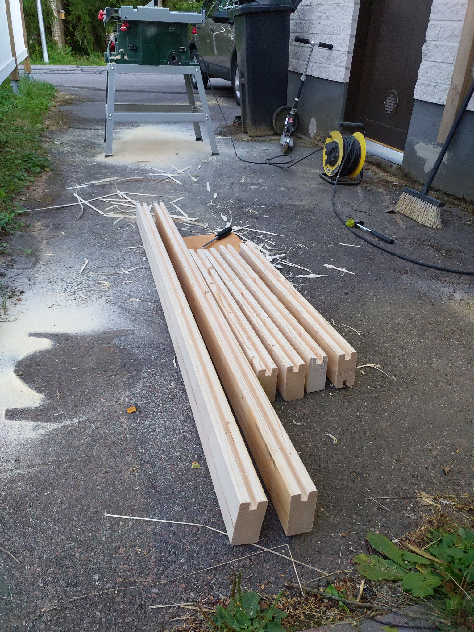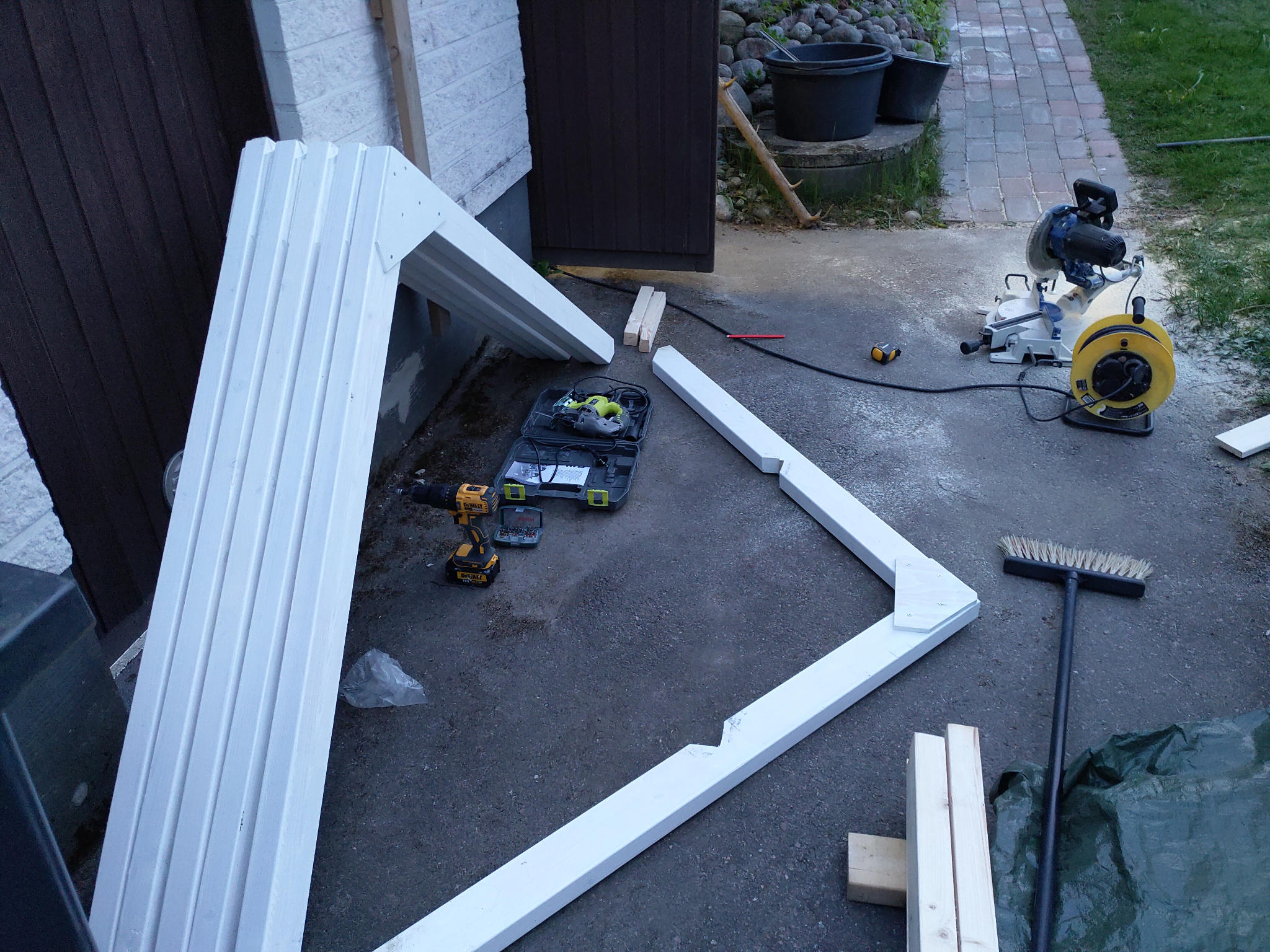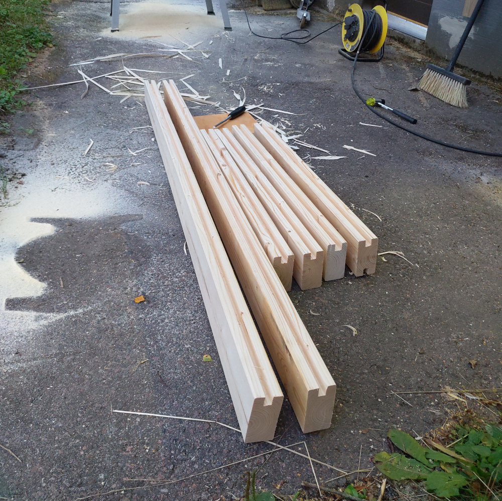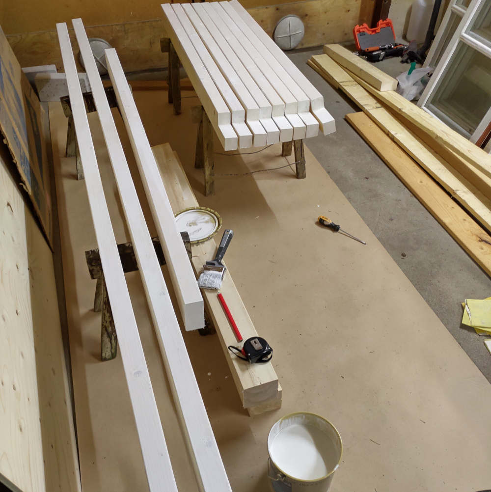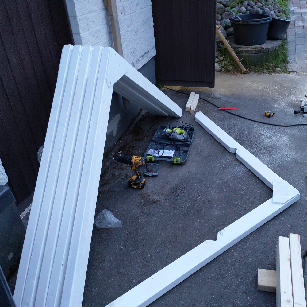 Runko sahattiin mittoihin ja pohjamaaliin autotallissa, jonka jälkeen mittoihin sahatut osat oli nopea kiinnittää paikoilleen ja sutia päälle lopullinen maalikerros.