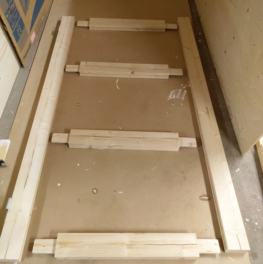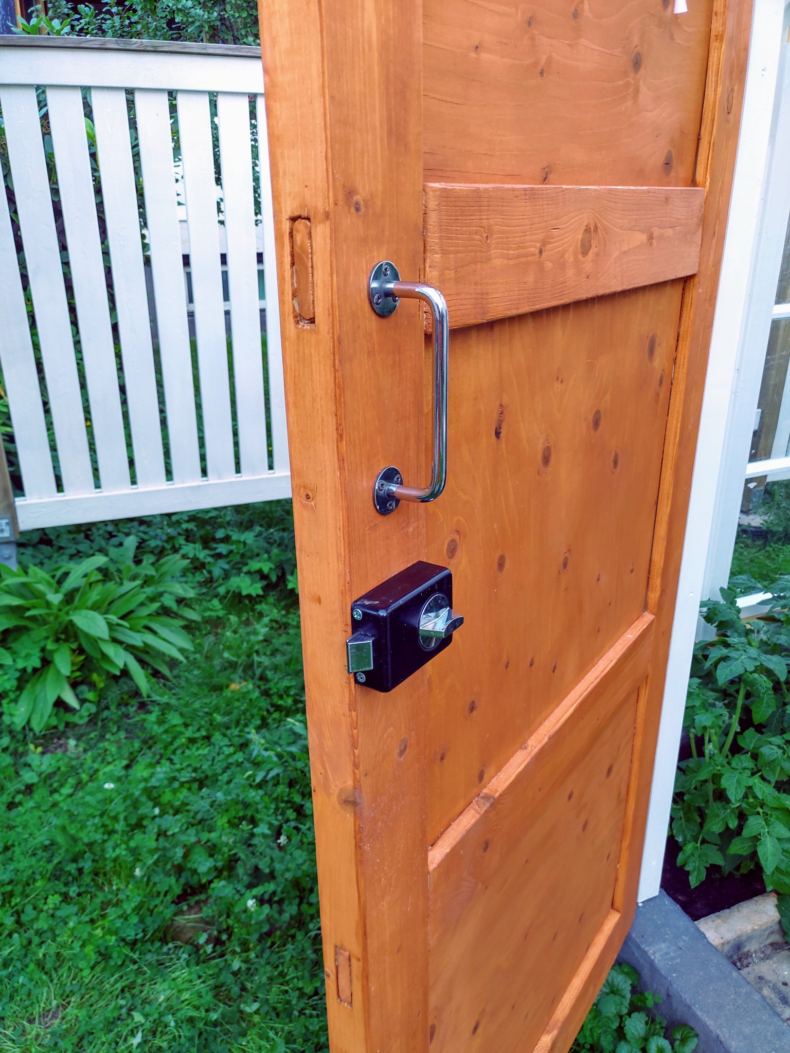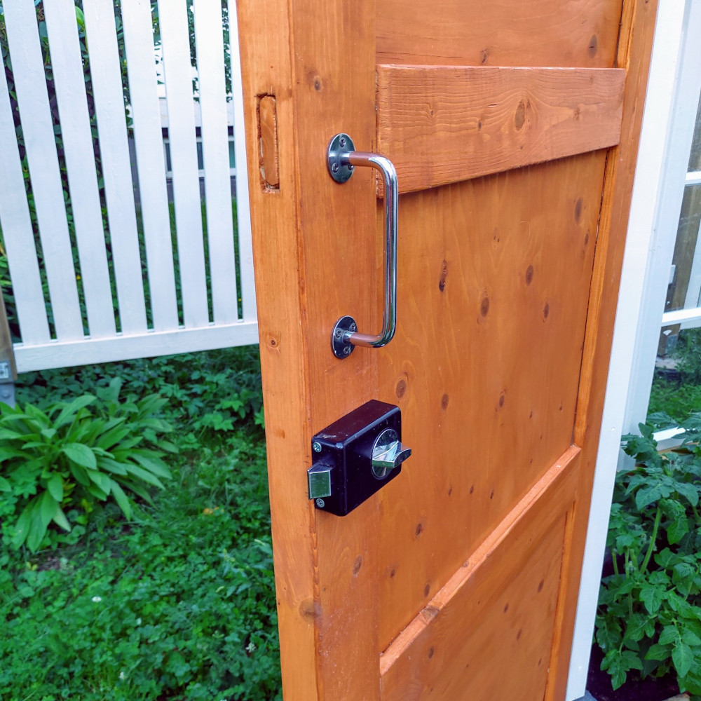 Ovi saatiin askarreltua kokoon varaston perukoille jääneistä puutavarasta ja vanerista. Saatiinpa myös kätevästi varaston oven uusimisen yhteydessä otettua vanha pintalukkokin vielä hyötykäyttöön kasvihuoneeseen.