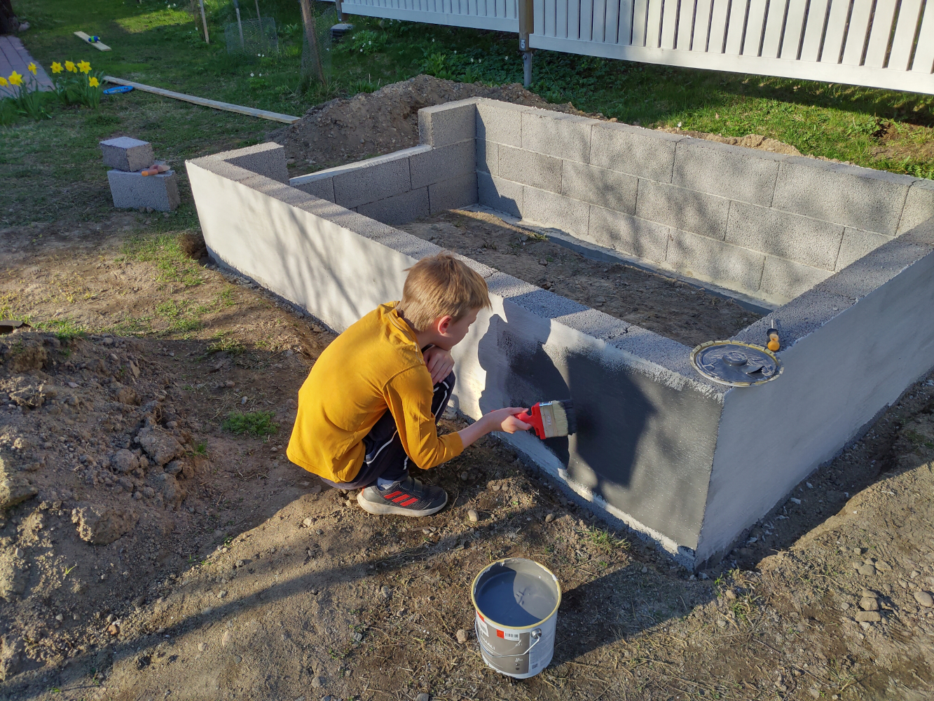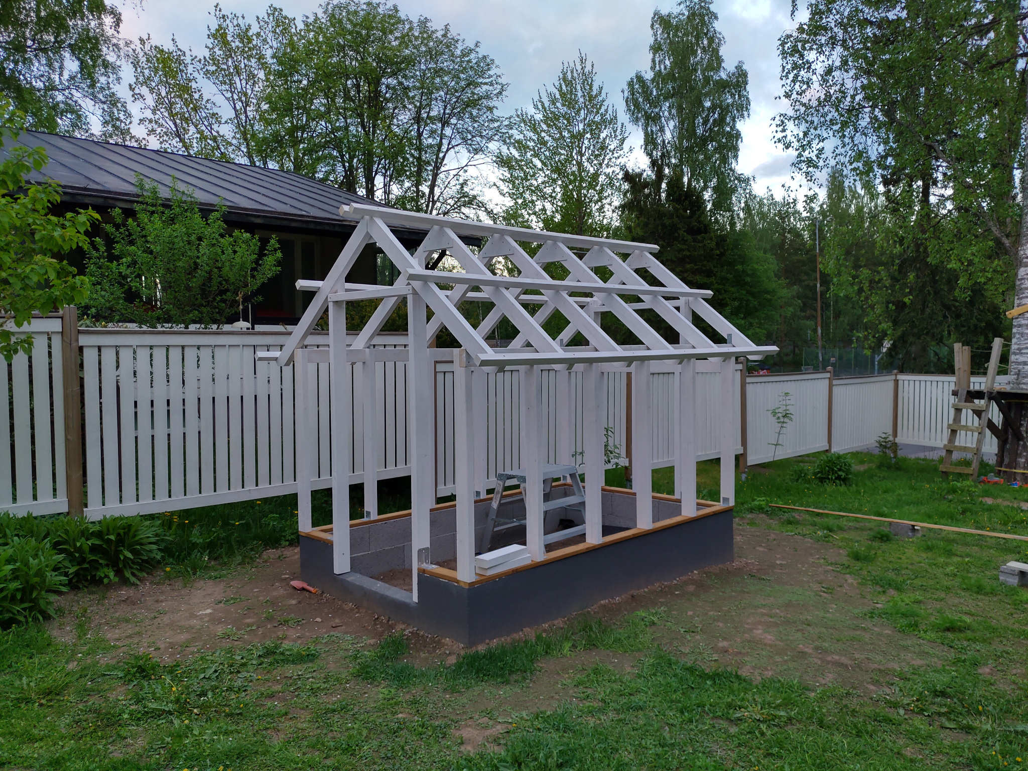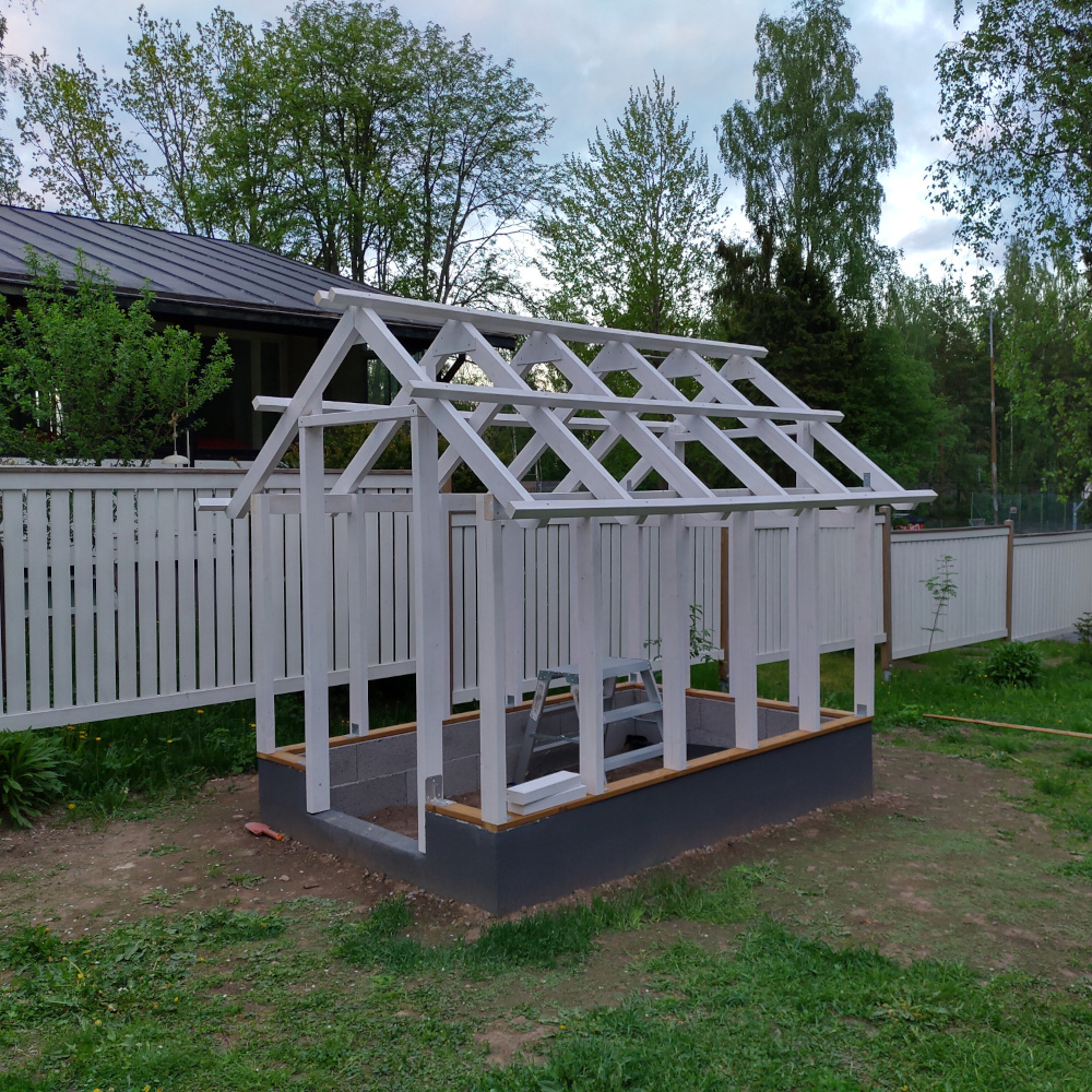 Kaikki rakentaminen alkaa tietysti perustuksista. Itse kasvihuone ei kummoisiakaan perustuksia tarvitse. Alaosa muurattiin kevytsoraharkoista, joka myös pienessä rinteessa mahdollistaa maanpinnan saamisen tasaiseksi kasvihuoneen sisällä. Sokkeli tasoitettiin ja maalattiin samaan sävyyn varsinaisen rakennuksen sokkelin kanssa.