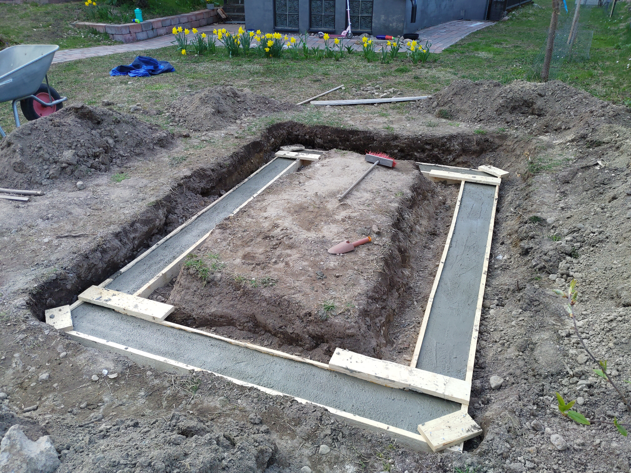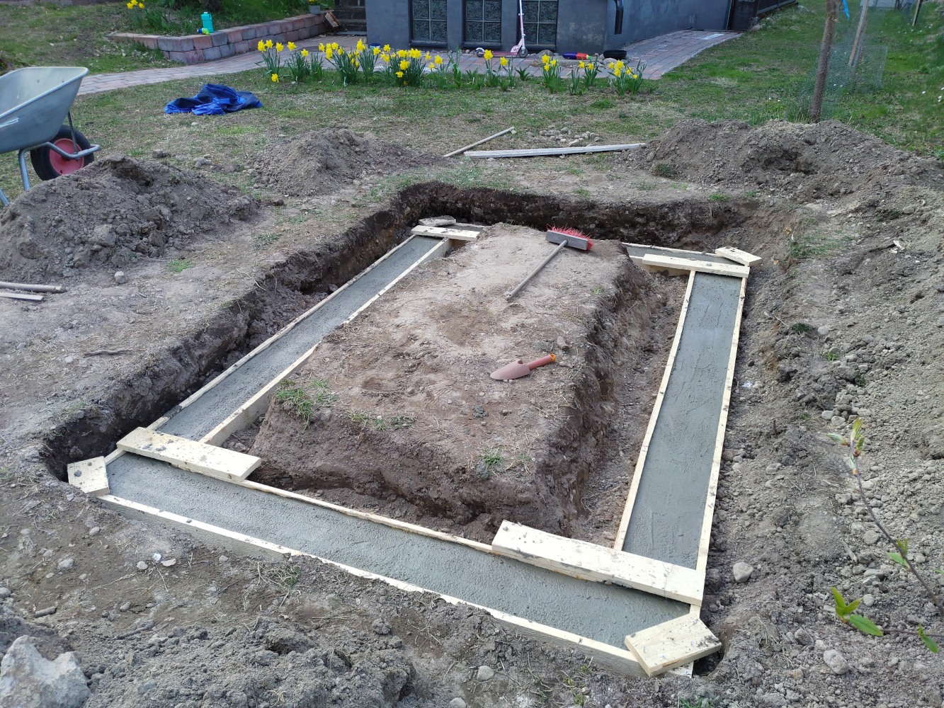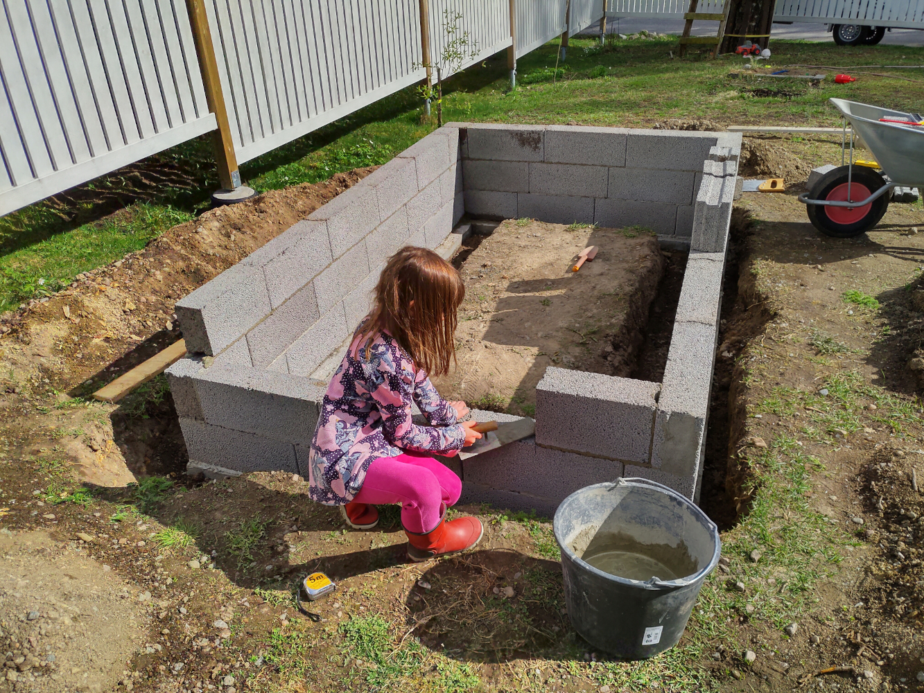 Kaikki rakentaminen alkaa tietysti perustuksista. Itse kasvihuone ei kummoisiakaan perustuksia tarvitse. Alaosa muurattiin kevytsoraharkoista, joka myös pienessä rinteessa mahdollistaa maanpinnan saamisen tasaiseksi kasvihuoneen sisällä. Sokkeli tasoitettiin ja maalattiin samaan sävyyn varsinaisen rakennuksen sokkelin kanssa.