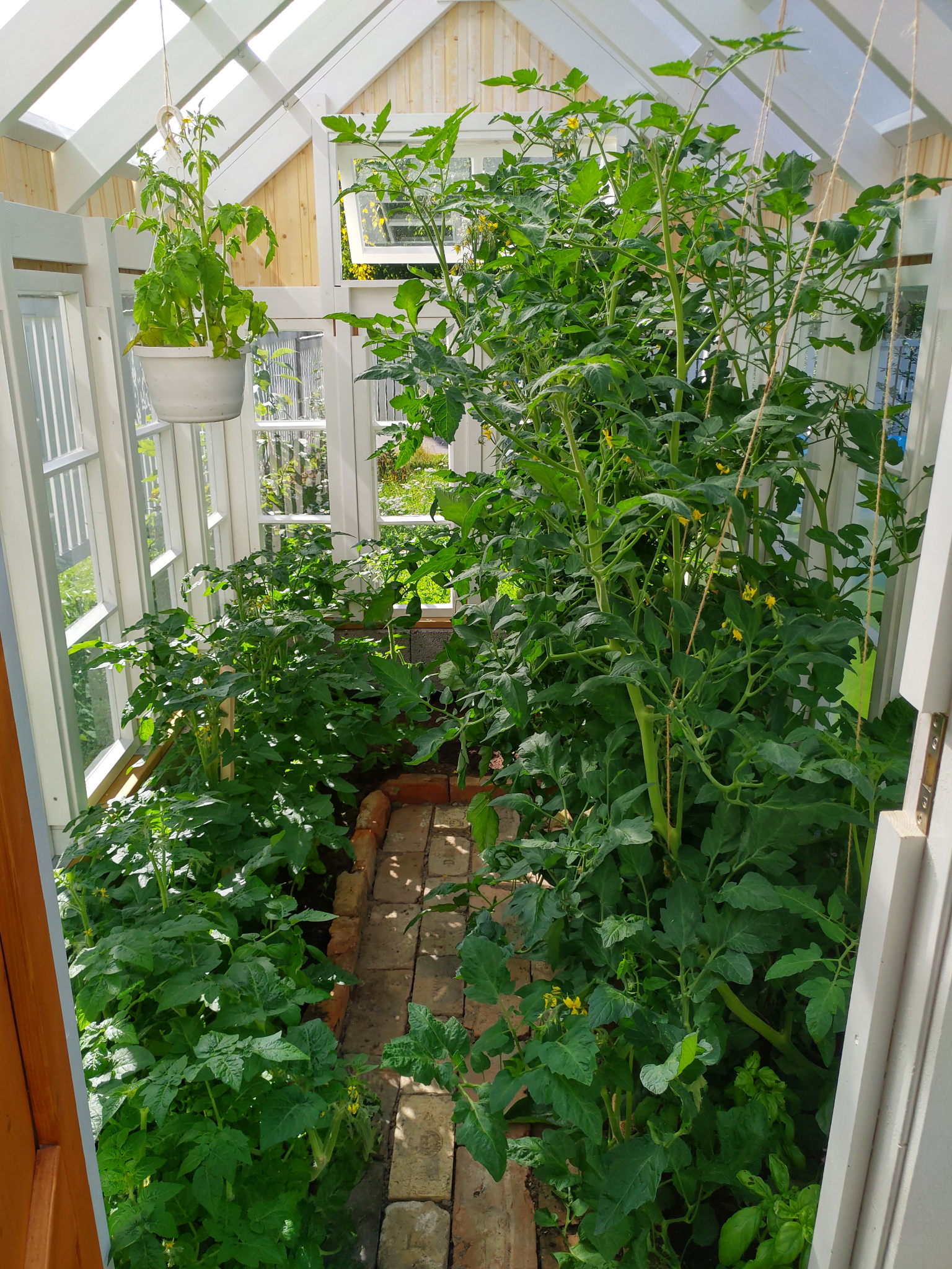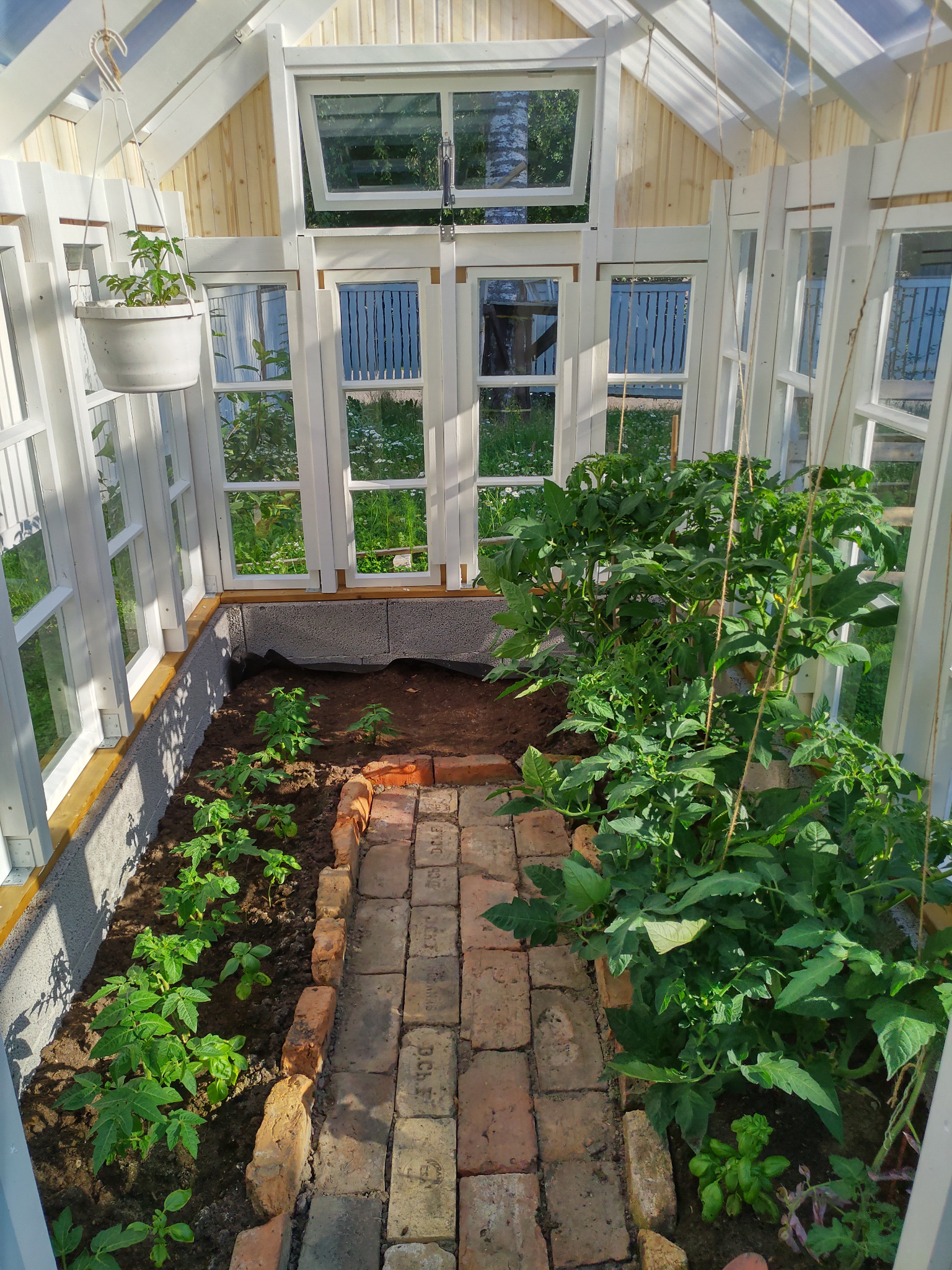 Vesikatteeksi tuli kennokate, jonka tulisi pitää hieman paremmin lämpöä sisällä. Ikkunaan kiinnitettiin Univentin automaattiavaaja, joka lämpötilan noustessa automaattisesti aukaisee tuuletusikkunan. Lattialle aseteltiin vanhoista purkutiilistä pieni polku. Ja tomaatitkin tässä vaiheessa jo hyvässä kasvussa, vaikka ovi vielä puuttuikin…