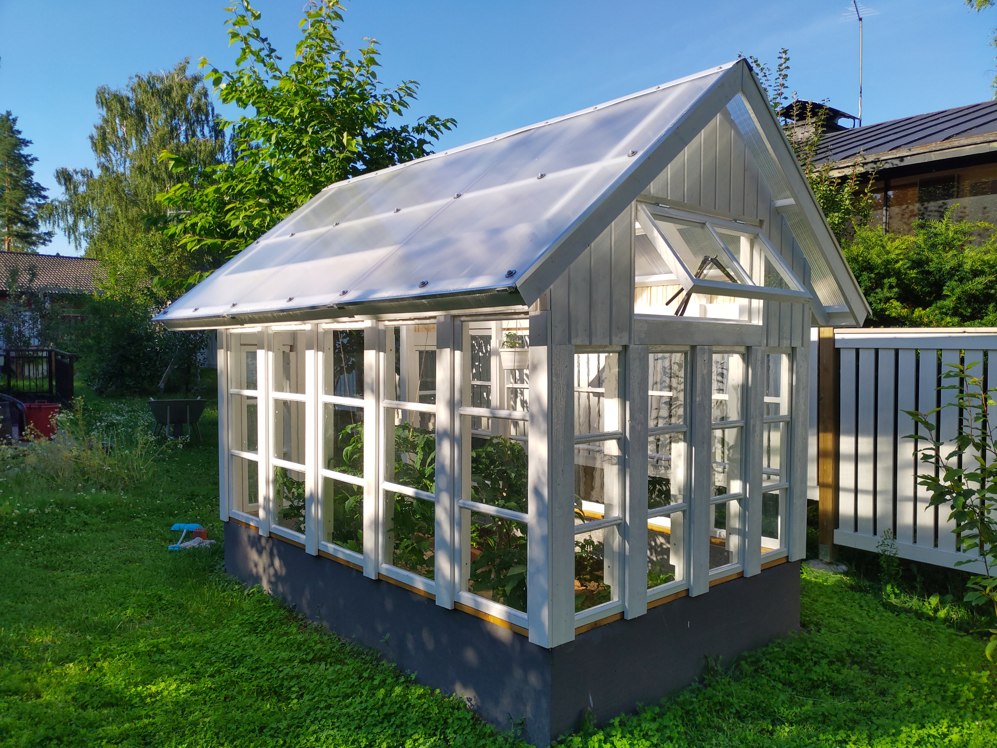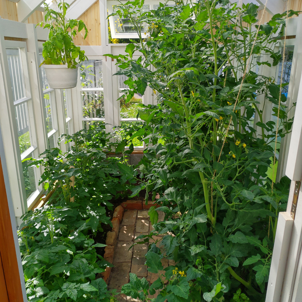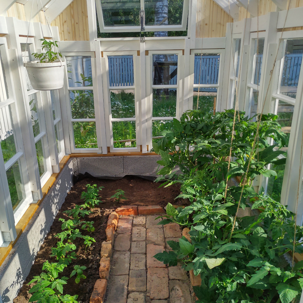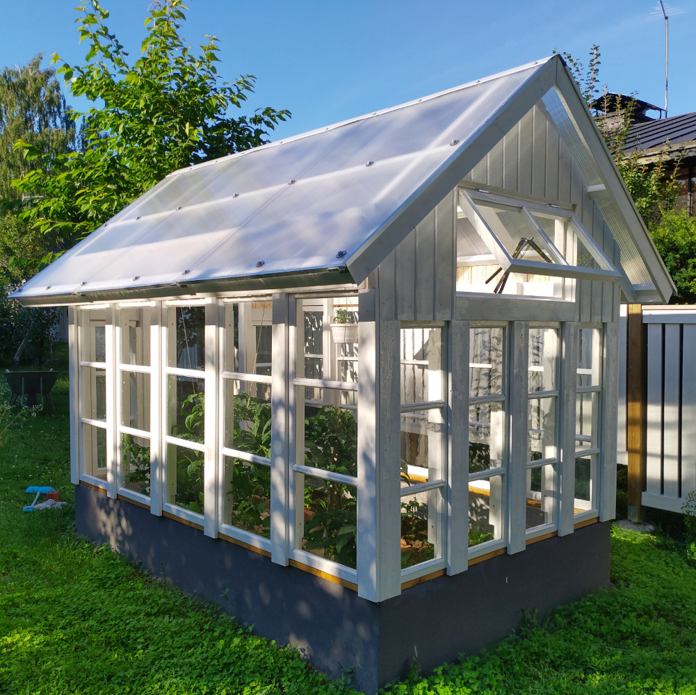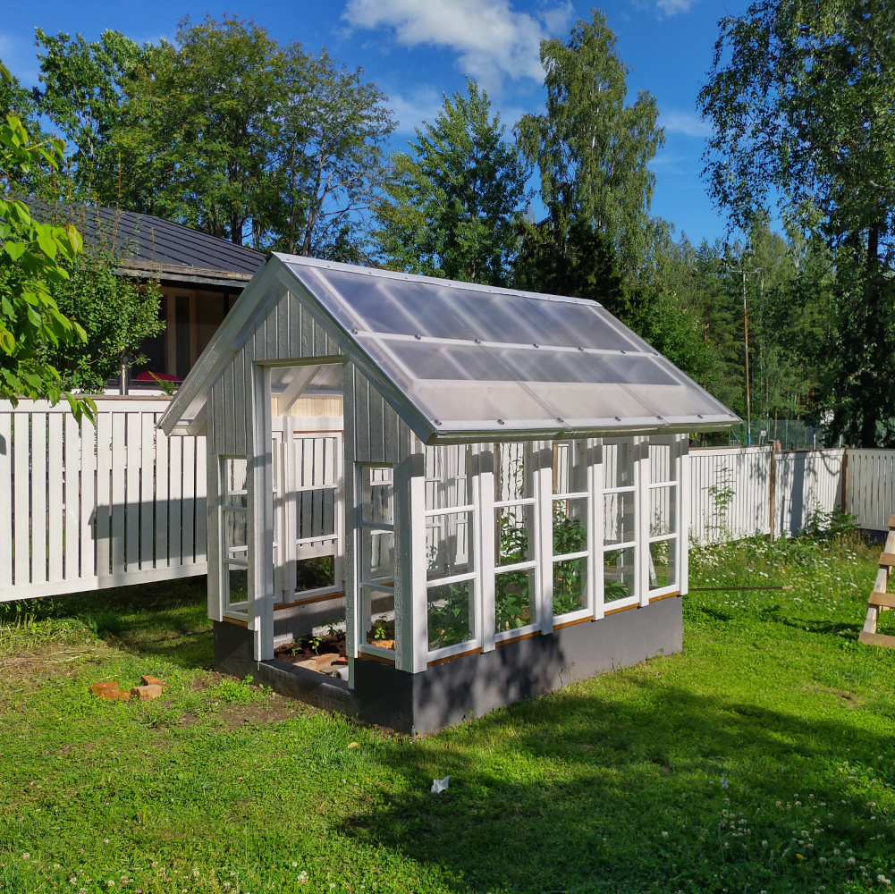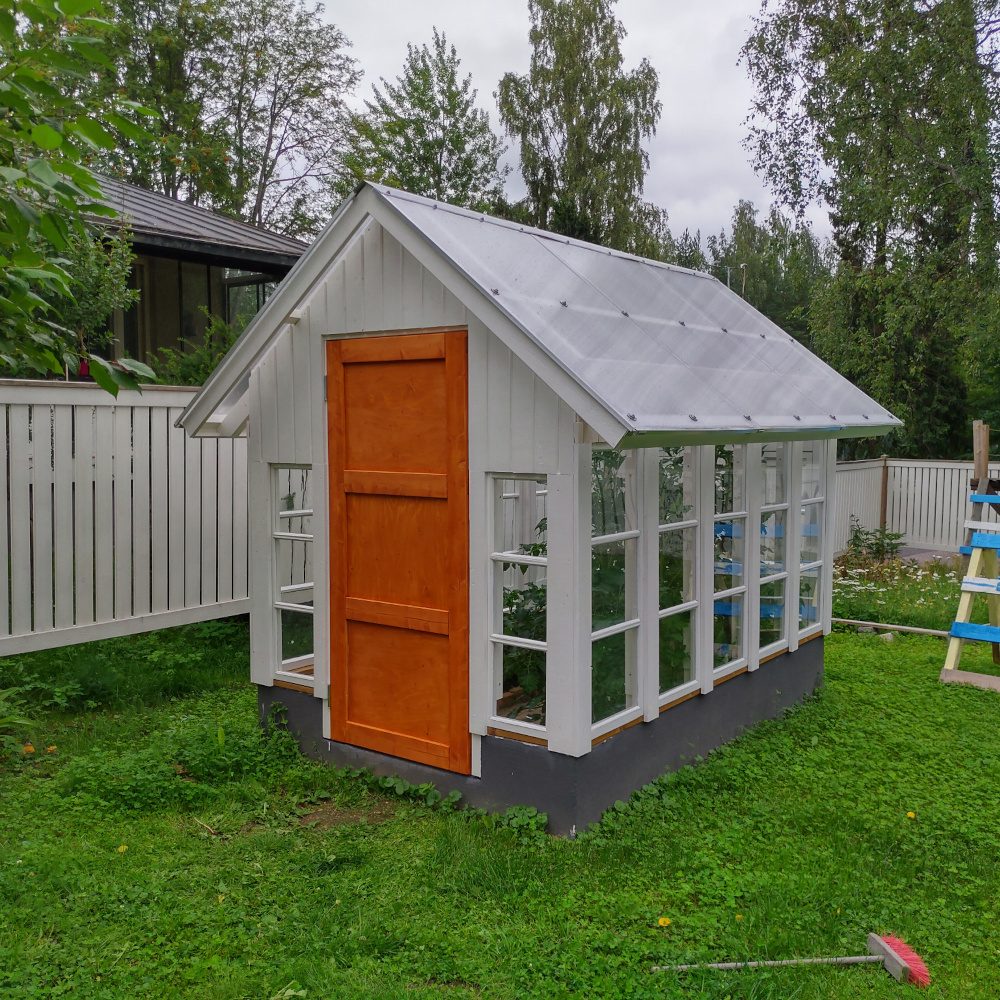 Vaikka ensimmäisen kesän istutukset pääsivätkin käyntiin vasta melko myöhäisessä vaiheessa, satoa tuli jo kohtalaisesti. Toki valtaosa tomaateista jouduttiin lopulta ottamaan kypsymään sisätiloihin. Kasvihuonesta tuli myös ihan sympaattinen pikku mökkerö pihalle. Ja mikä parasta, käsityönä tehdyt ikkunat saivat uuden elämän!