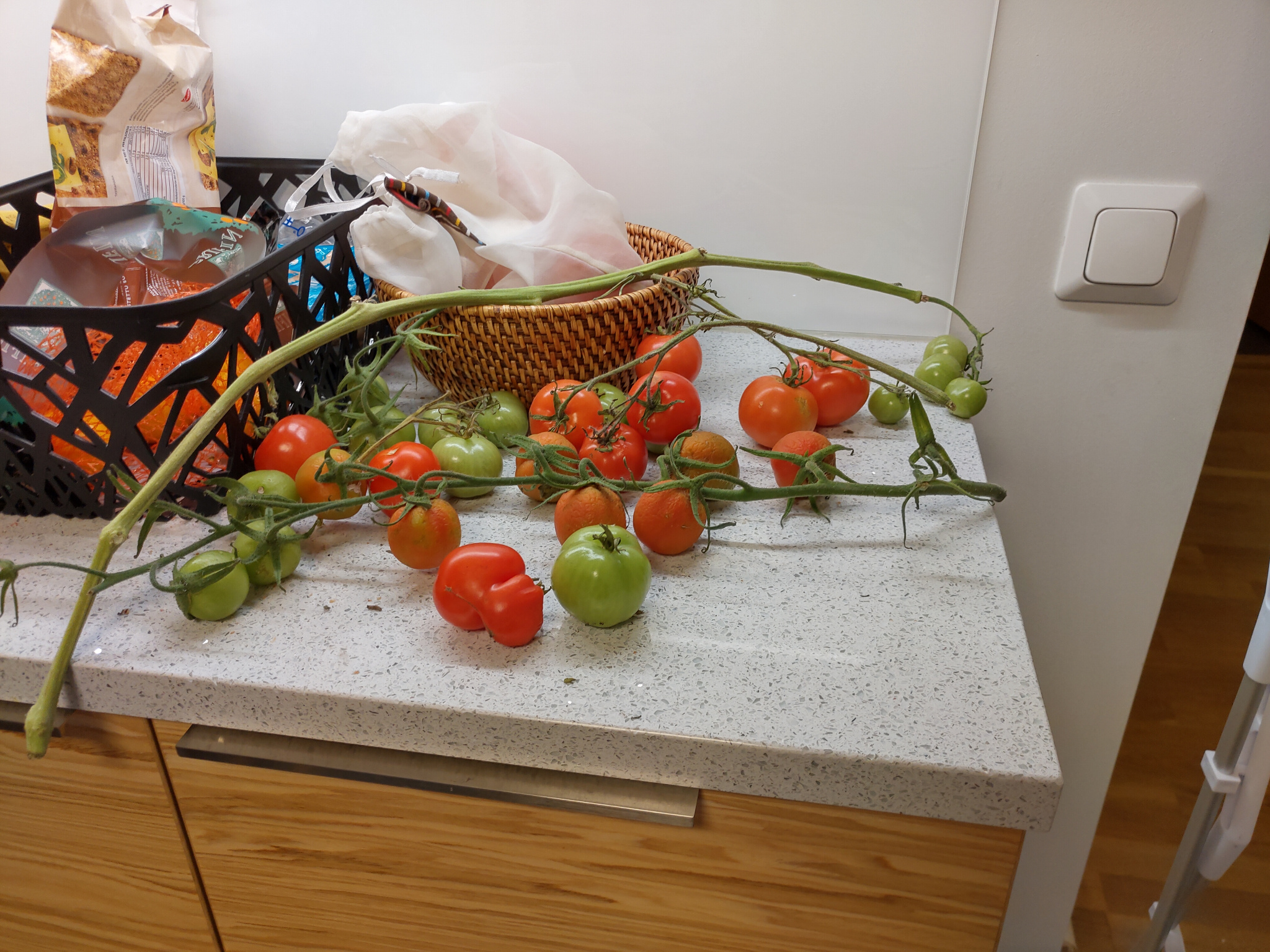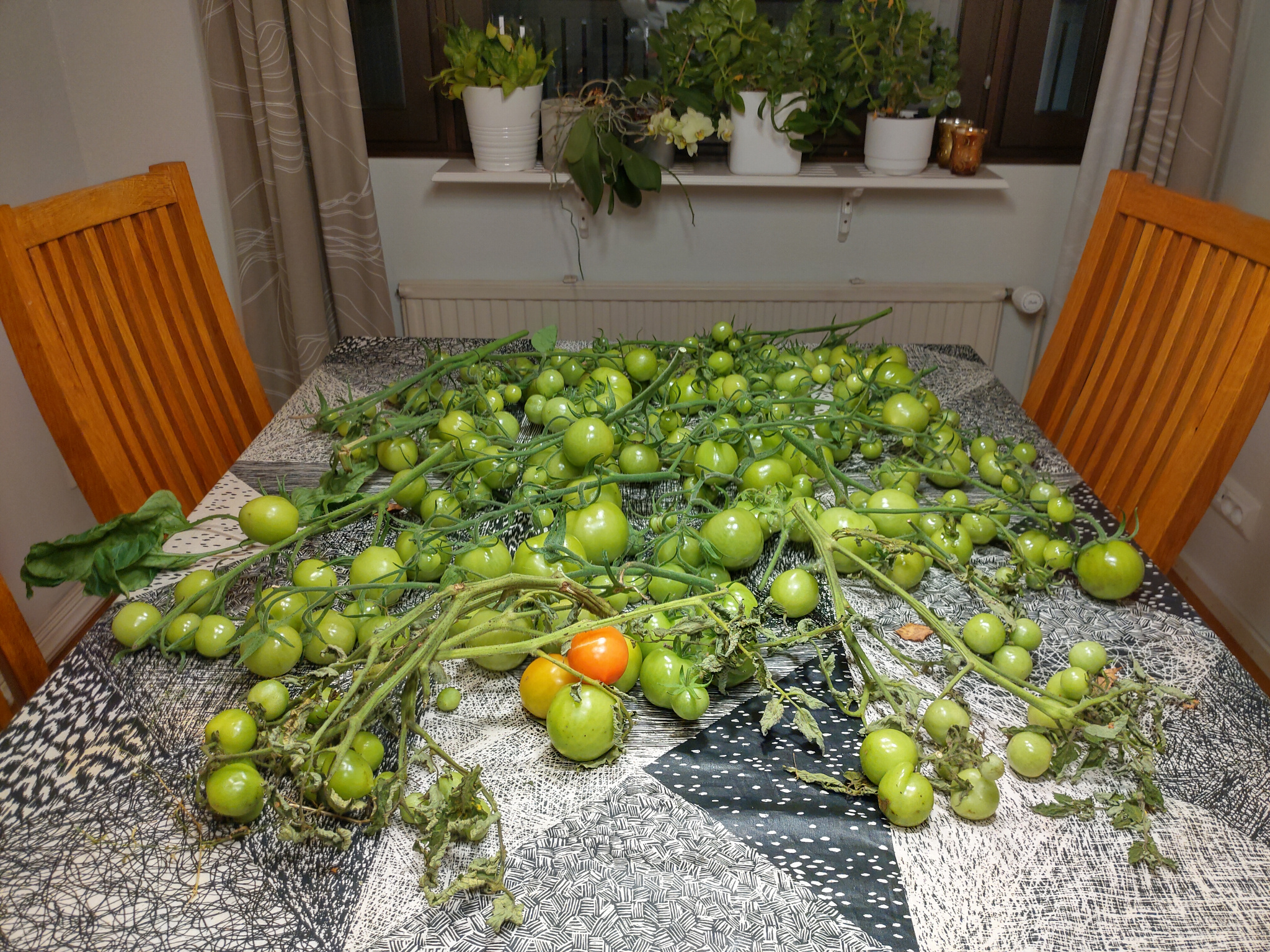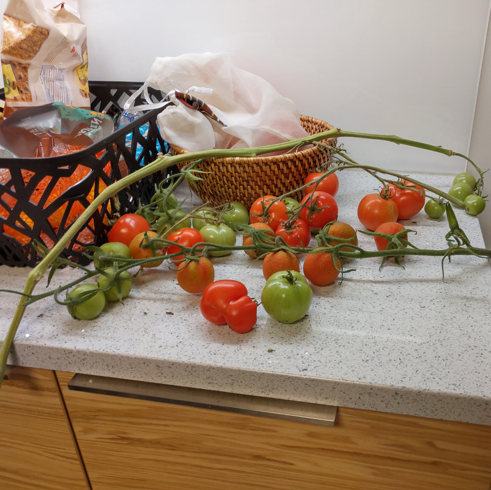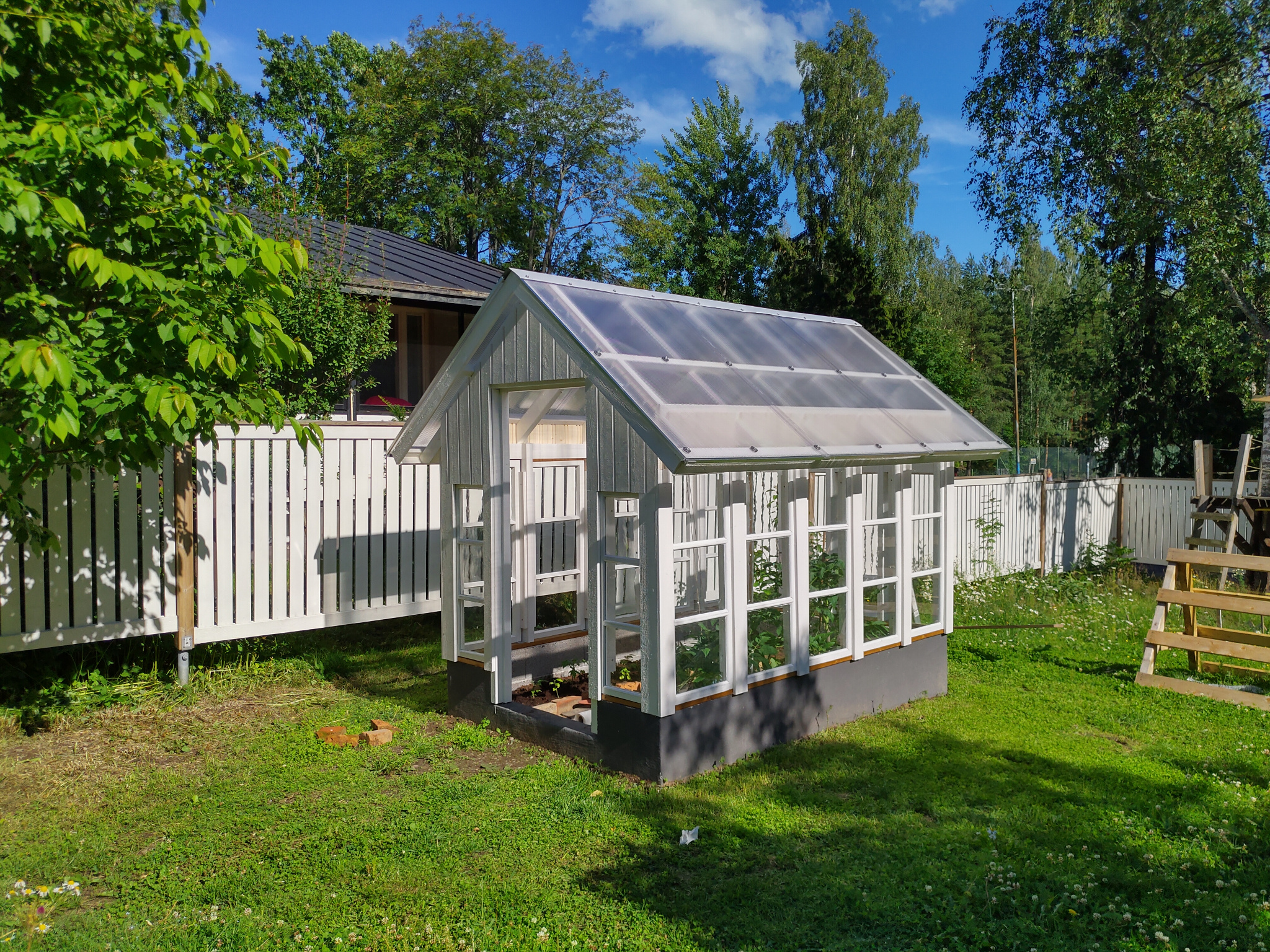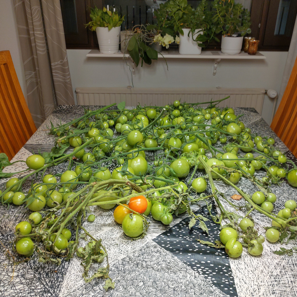 Vaikka ensimmäisen kesän istutukset pääsivätkin käyntiin vasta melko myöhäisessä vaiheessa, satoa tuli jo kohtalaisesti. Toki valtaosa tomaateista jouduttiin lopulta ottamaan kypsymään sisätiloihin. Kasvihuonesta tuli myös ihan sympaattinen pikku mökkerö pihalle. Ja mikä parasta, käsityönä tehdyt ikkunat saivat uuden elämän!